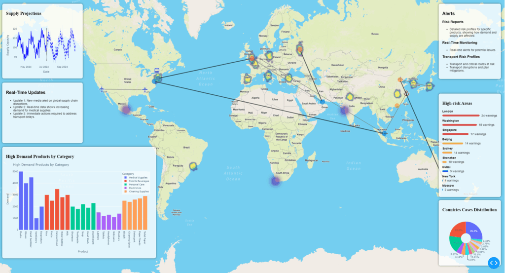 To capture real-world interdependencies, the platform employs Graph Neural Networks (GNNs) that represent supply networks as evolving graphs of suppliers, products, routes, and policies. This enables early identification of single points of failure, ripple-effect propagation, and robust scenario testing. Large Language Models (LLMs) ingest unstructured signals-policy changes, trade advisories, incident reports, and market news to augment situational awareness, explain flags, and assist with resource allocation and playbook selection. Rule Association Mining (latent dependency discovery) uncovers subtle patterns that link events across tiers.